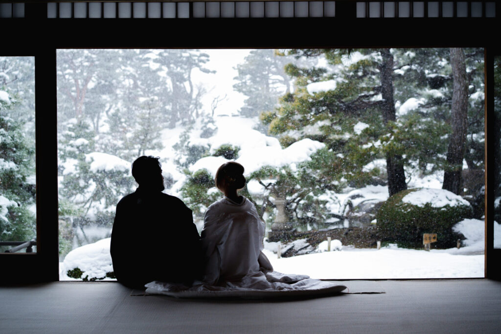 雪が収まることがなく、残念ながらお庭の散策をすることはできませんでしたが、屋内から幻想的なお写真を撮影することができました。