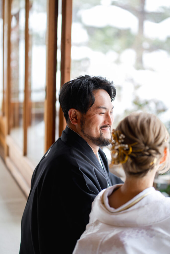 正座で足をしびれさせてしまった新郎様、足のしびれにも耐えてステキな表情です。