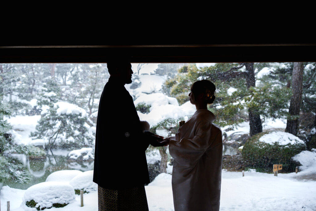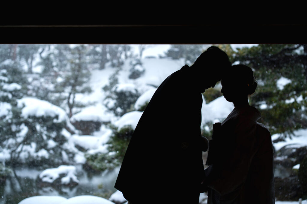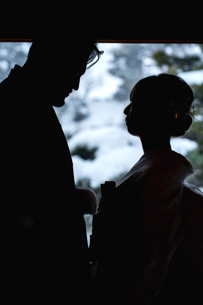 お庭と雪をバックにシルエット写真の撮影です。