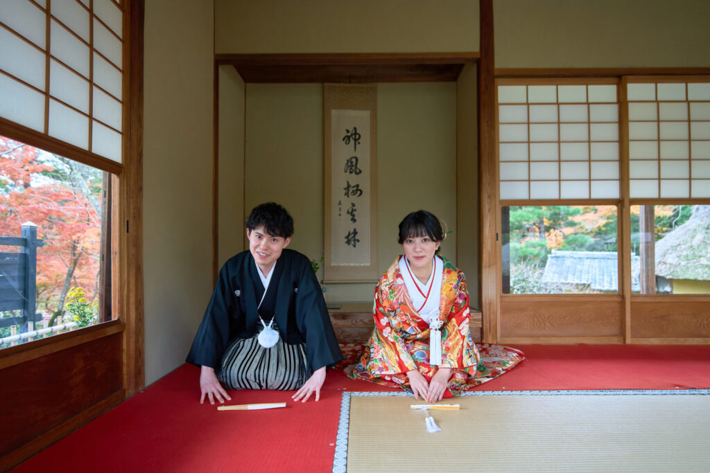 玄宮園から式場に帰ってきて洋装の撮影です。
